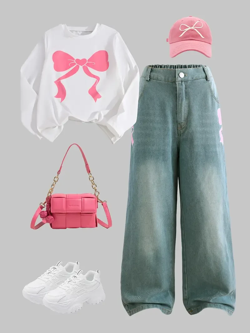 Chic and comfy set featuring a white sweatshirt with a big pink bow print and gray wide-leg jeans with cute bow details. Perfect for casual outings or everyday wear.