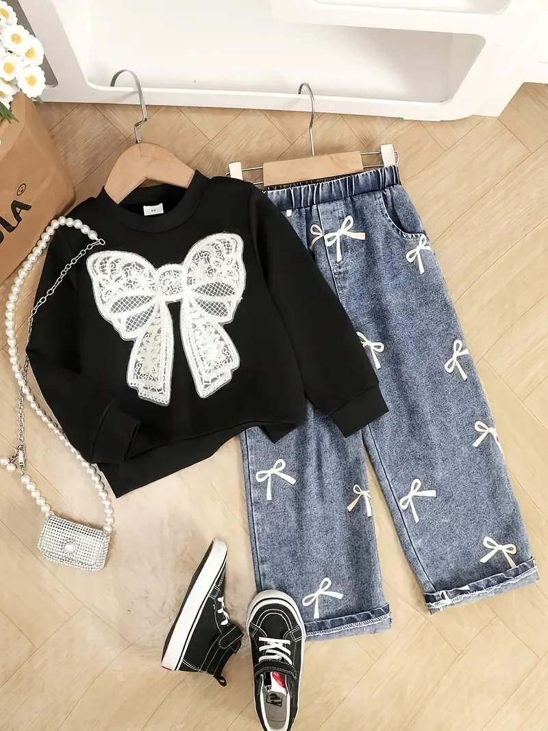 Girls 2-Piece Bow Sweatshirt & Denim Pants Set